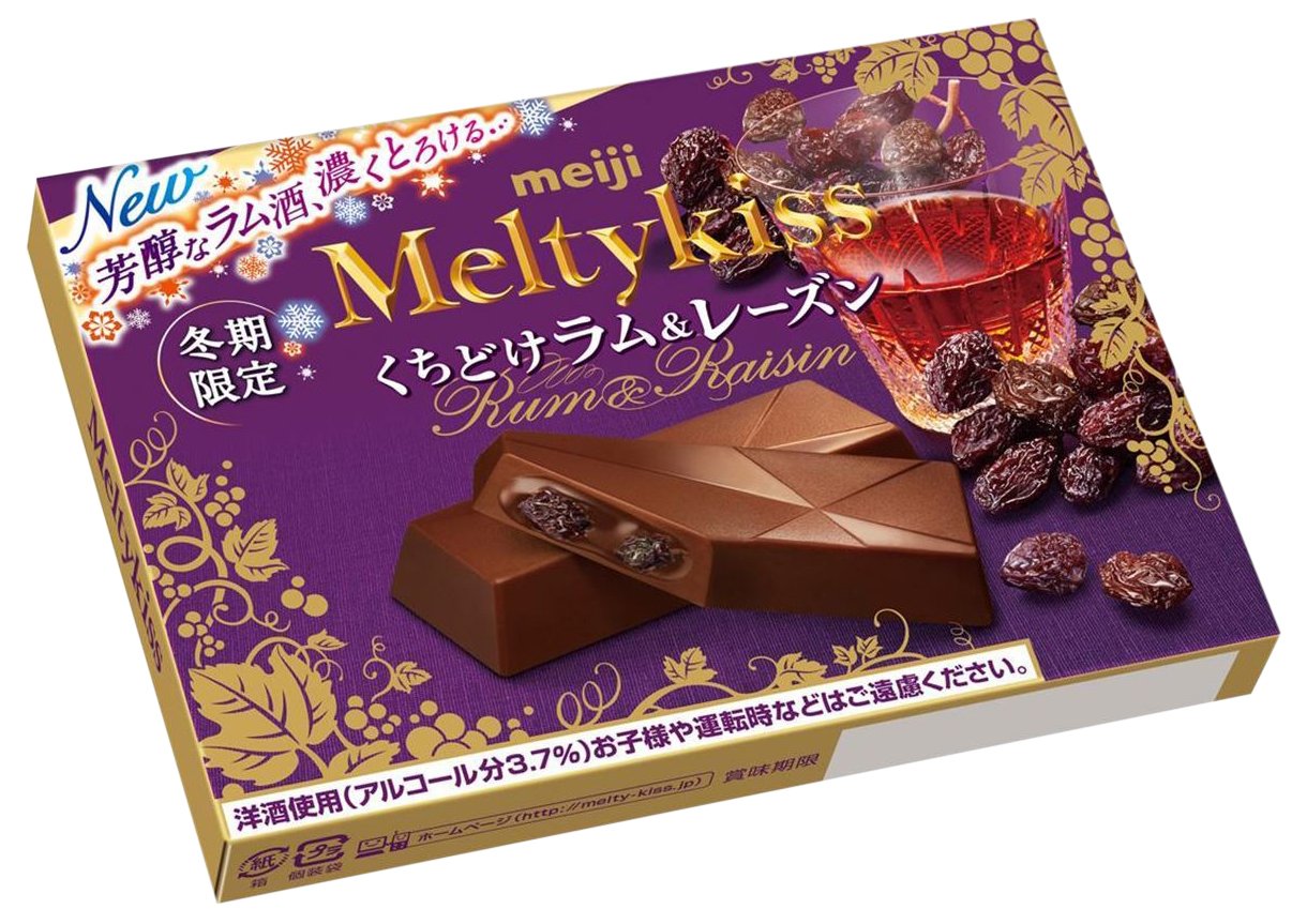 冬季限定。香り立つ芳醇なラム酒深く長い幸せの余韻。ダークラムに浸したレーズンをくちどけの良いチョコレートで包みこんだ、香り高く濃厚なあじわい。ラムレーズンの濃密な味わいが人気の、冬の定番商品「メルティーキッスくちどけラム&レーズン」がさらに美味しくなって新登場。洋酒を改良し、ツンとしたアルコール感を抑え、鼻に抜けるようなラム本来の香り・風味を引き立てる味わいになりまいた。芳醇なマイヤーズラムを中心にブレンドしたラム酒と、みずみずしいレーズンの組み合わせをご堪能ください。明治は、赤ちゃんからお年寄りまで、いろいろなシーンでいつもあなたのそばにありたい。おいしさであなたとずっとつながっていたい。昨日より今日、今日よりも明日。あなたの明日をもっとおいしくするために。