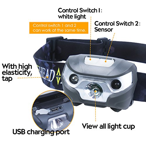 -. Feature : ✔ SENSOR CONTROL AND USB RECHARGEABLE - QPAU headlamp lighting with IR sensor control of a hand's wave and full charge from any USB port ,no need to waste your money buying batteries again and again; This allows you to see details at a distance up to 450 meters; / ✔ SUPER BRIGHT CREE LED HEADLAMP - Super bright Head Mounted Flashlight with Red Light for Night Vision, double switch designed for either Red LED or white light to adjust DIMMABLE Lumens between 3 lighting model; / ✔ ADJUSTABLE AND COMFORTABLE HEADBAND - Comfortable Head mount strap built in high elasticity tap and designed with View All Light Cup sized for Adults and Kids - Weighing only 2.8 OUNCES with easily adjustable, you won't even notice wearing it; / ✔ DURABLE AND WIDE OF USES - Perfect for indoor and outdoor use, best headlamps for adults & kids- cycling, running, walking, fishing, hunting, hiking, reading and other more activity; / ✔ 100% MONEY BACK GUARANTEE WITH FREE RISK-We're so confident of our product quality, if you don't love your headlamp for whatever reason, we will replace a new one or get your money back - Also we are proud to offer you one year free replacement warranty.