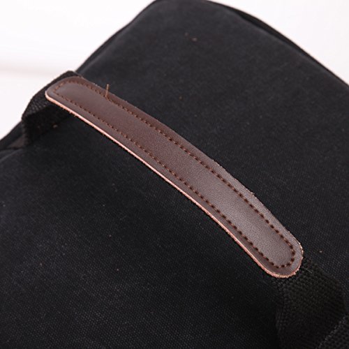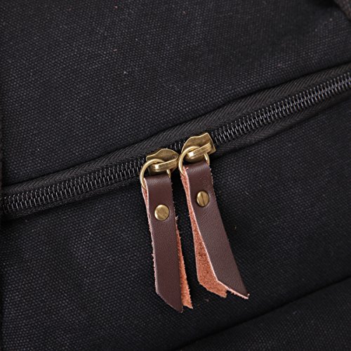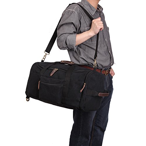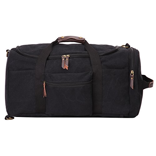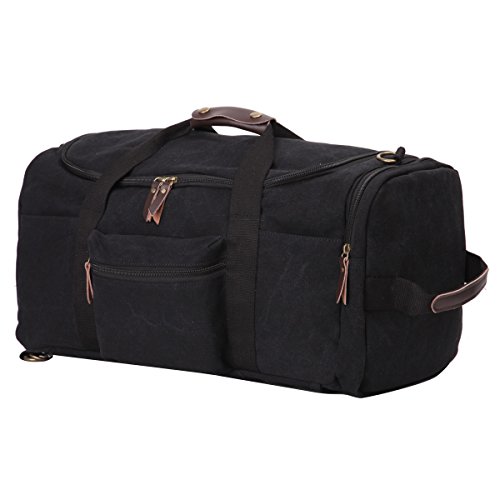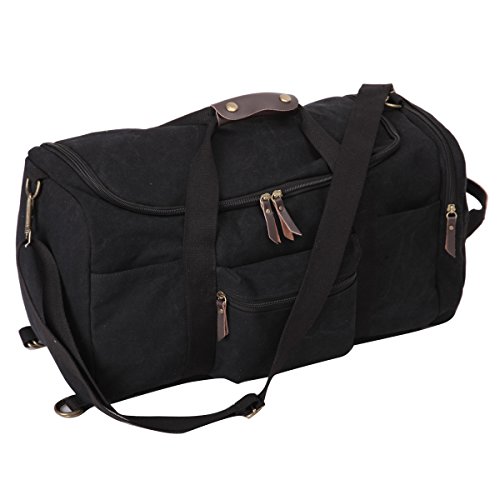 -. Feature : Material: Premium quality cotton canvas, Dimensions: 16.9" W x 9.8" H x 10.6" D,Style: Retro, Casual, Outdoor / Featuring versatile carrying options, Soft straps offer comfort when carrying heavy loads.The shoulder straps with 5MM thick cotton cushion,can relief the pressure to the shoulder / Exterior: 1 zipped pocket; Interior:1 zipped pocket for small necessaries, 2 Large compartment for laptop, ipad or books etc.Large capacity,many pockets,can be used for a week travel / 100% leather trim,high grade hardware,adjustable and removeable shoulder strap for easy and comfortable carrying when you use it as a shoulder bag. High quality nylon zipper,long life. / excellent craftmanship,Nylon suture,bearing well.Humanization design and multi-functional travel duffel bag. It can be used as a backpack, a shoulder bag ,a crossbody bag and a tote bag. One bag offers at least four different ways of carrying. can fit 14'' Laptop, Ipad, several clothes and shoes together.Both sides can be tied with long shaped objects,such as camera tripod, TPE,tennis rackets,climbing stick