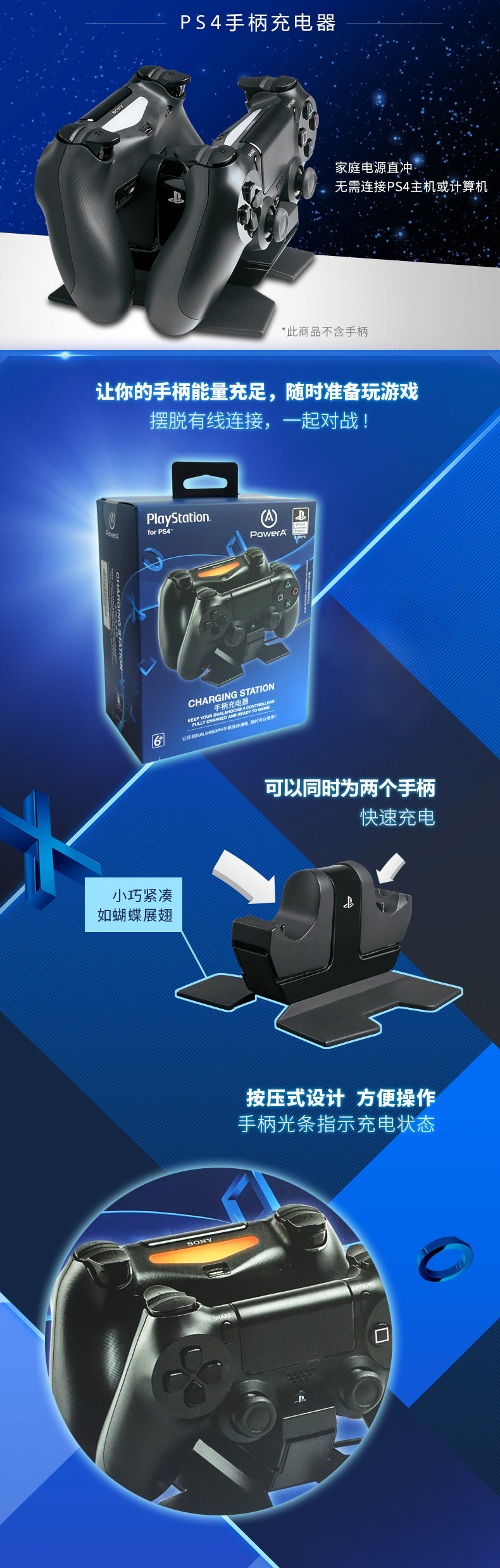By using this charger, the player can charge two PS4 handles at the same time (the handle if used to remove the protective sleeve), without having to connect them with the PS4 host. Players can simply plug the PS4 handle into the charger and plug the charger into a household power outlet to complete charging the handle.