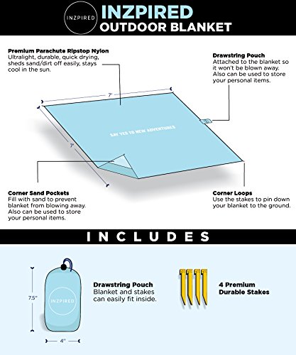 SAND POCKETS AND EXTRA STAKES - Fill the four corner pockets with sand to keep your blanket in place on the beach. Or use the corner loops to stake it into the grass at the park (stakes included).