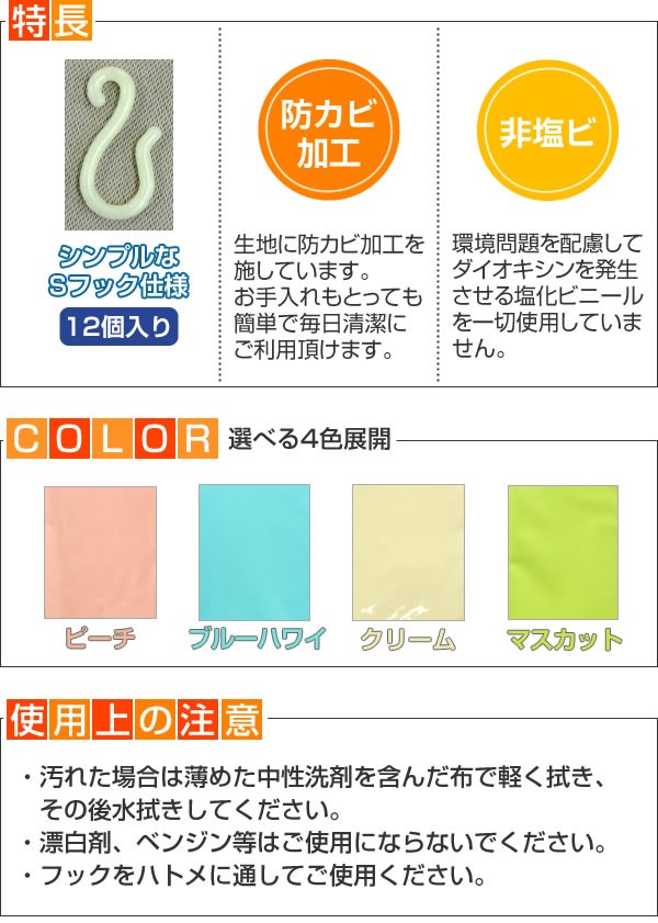 防カビ加工を施したシャワーカーテンです。4つのカラーからお選びください。