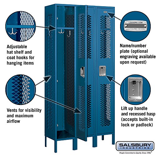 Salisbury 71000 Series Single Tier Vented Metal Lockers are ideal for health clubs, locker rooms, employee changing rooms, gyms and many other applications where visibility and maximum airflow is needed. Available as unassembled or assembled (additional charge for assembled). Feature a durable powder coated finish available in gray, tan or blue. Available in 6 foot height (add 6" for legs). Units have a compartment size that is 12" wide, 72" high and 12", 15" or 18" deep. Available as 1 wide or 3 wide units. Each locker compartment features an adjustable hat shelf and 3 wall hooks (the 18" deep lockers also include a coat rod). Salisbury Industries is an ISO 9001: 2008 certified company and has excelled in the field of manufacturing since 1936.Feature
