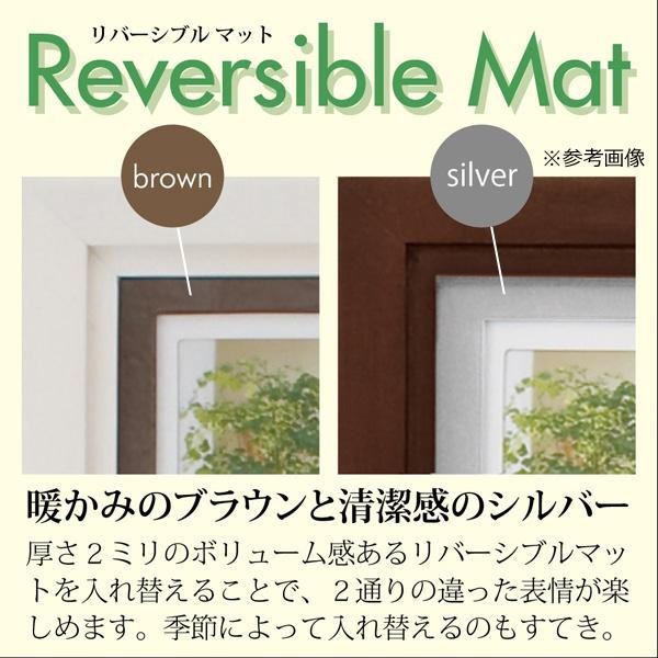 落ち着いた色味で高級感のあるフォトフレームです。ホワイトマット1枚と、ブラウン/シルバーのリバーシブルマット1枚がセットされています。 |