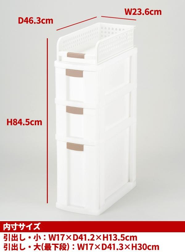 | サイズ | 本体サイズ:W23.6×D46.3×H84.5cm、引出し(大)内寸:W17×D41.3×H30cm、引出し(小)内寸:W17×D41.2×H13.5cm 個装サイズ:25×47×86cm |