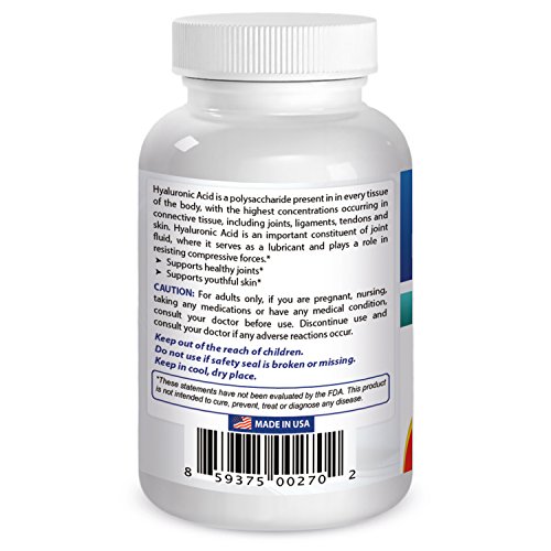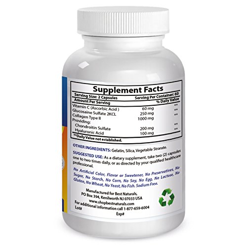 Best Naturals HYALURONIC ACID formula contains 100 mg HA per serving, complex with chrondroitin sulfate, Glucosamine Sulfate and COLLAGEN TYPE II ( bioavailabel for absorption), to alleviate joint pain and stiffness, and lubricate sagging, wrinkled skin & dry eyes