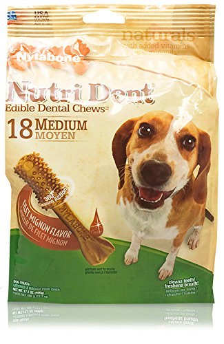 -. Binding : Misc. -. Brand : Nylabone -. Feature : Nutri Dent chews are clinically proven better than brushing*, leaving your dog with cleaner, fresher breath / Patented 360-degree cleaning nubs help reduce plaque and tartar buildup / Filet mignon flavor your adult dog will love / Made with natural ingredients and added vitamins and minerals / In clinical tests Nutri Dent reduces bad breath and tartar build-up more than weekly brushing -. Label : Nylabone -. Manufacturer : Nylabone -. Model : NTD601M18P-PARENT -. MPN : NTD601M18P-PARENT -. PackageQuantity : 1 -. PartNumber : NTD601M18P-PARENT -. ProductGroup : Pet Products -. ProductTypeName : PET_SUPPLIES -. Publisher : Nylabone -. Studio : Nylabone -. Title : Nylabone Nutri Dent Complete Filet Mignon Flavored Dog Treat Bone