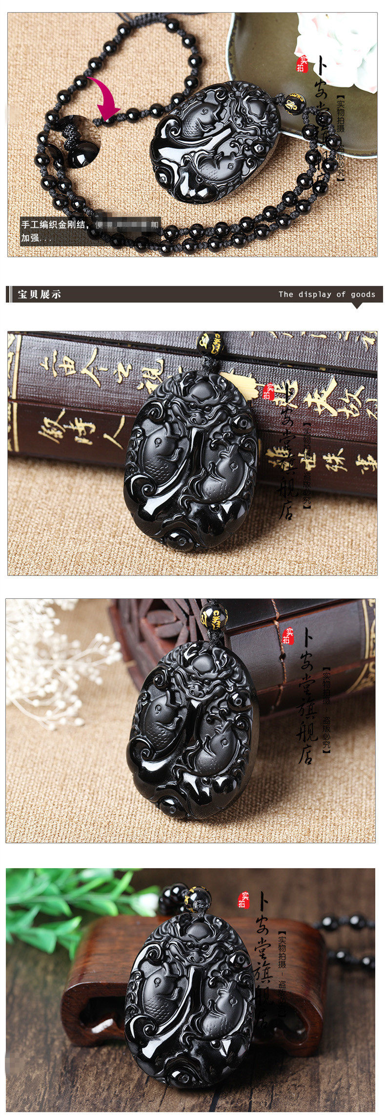 开光天然黑曜石锦鲤联珠锦鲤丰年吊坠灵鳌夺魁吊坠