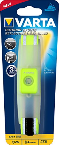 Im Lieferumfang enthalten sind 2x Varta CR2032 Knopfzellen. Die Leuchtdauer des Outdoor Sports Reflective LED Band betragt bis zu 25 Stunden