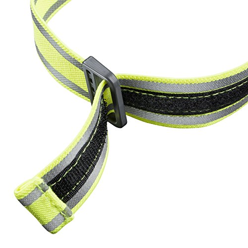Die spritzwassergeschutzte Leuchte (IPX4) ist leicht per Klettverschluss verstellbar und verfugt uber ein Elastomer-Gewebeband mit reflektierender Beschichtung
