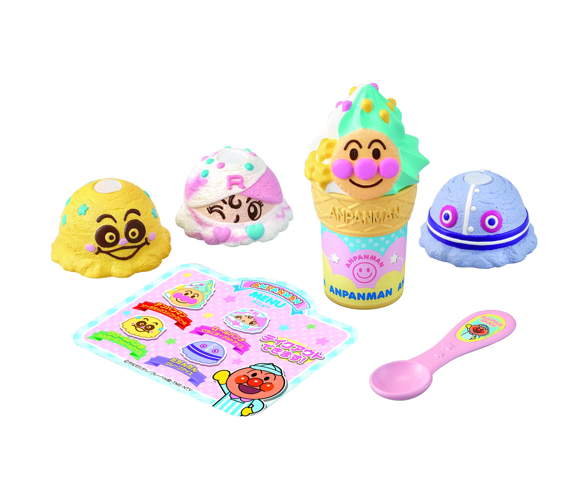 Includes: Soda Mix Soft Cream (Anpanman), Strawberry Yogurt Ice (Roll Panna), Custard Cream Ice (Cream Panda), Grape Ice (Dandan), Corn, Spoon, Menu List