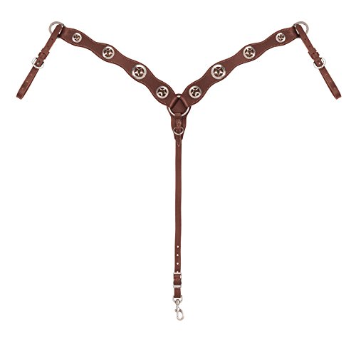 Studio : Weaver Leather, LLC Publisher : Weaver Leather, LLC Binding : Sports Product Description The flattering scalloped breast pieces on this rich Brown bridle leather breast collar are accented with nickel plated Texas star Conchos featuring a gold plated star. Wheat-colored stitching, smoothed and darkened edges, an adjustable center strap with snap, a tie down Dee and stainless steel hardware provide added appeal. 0