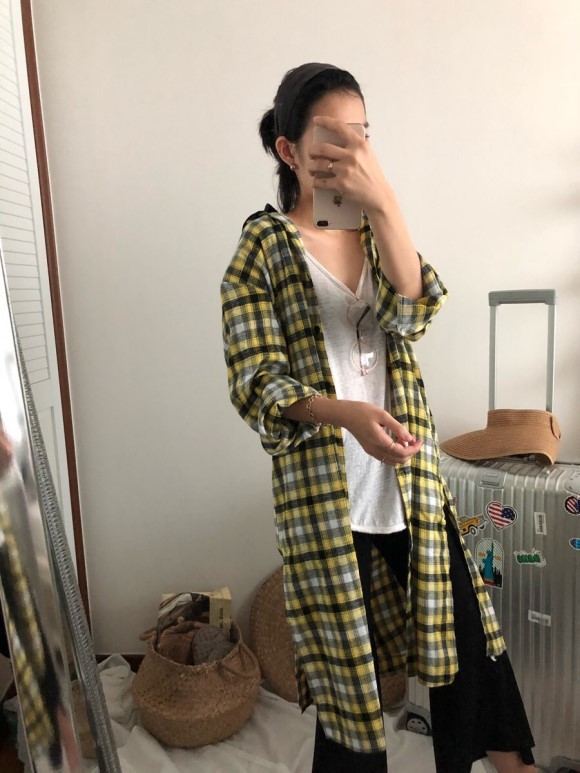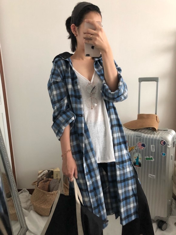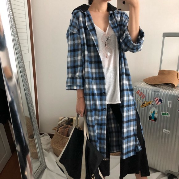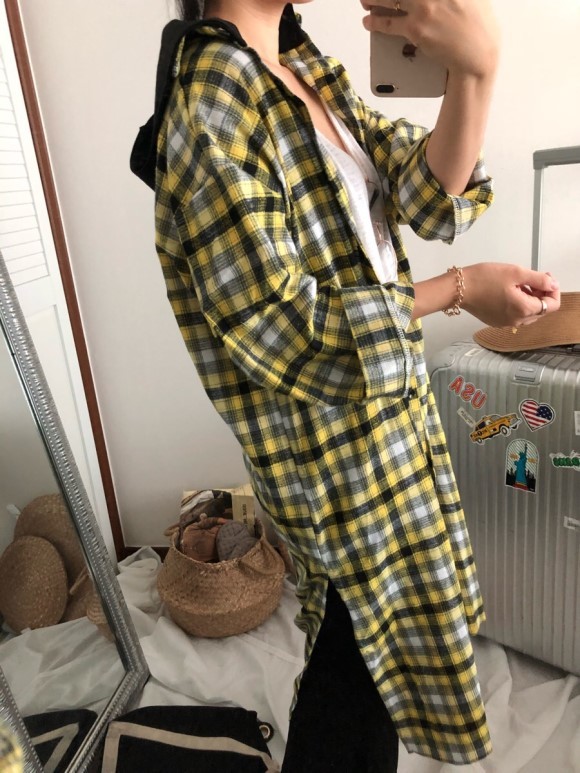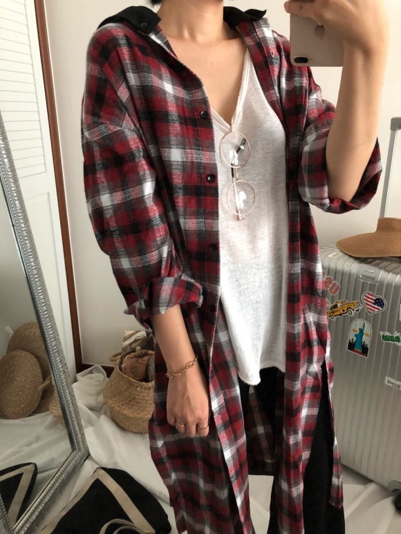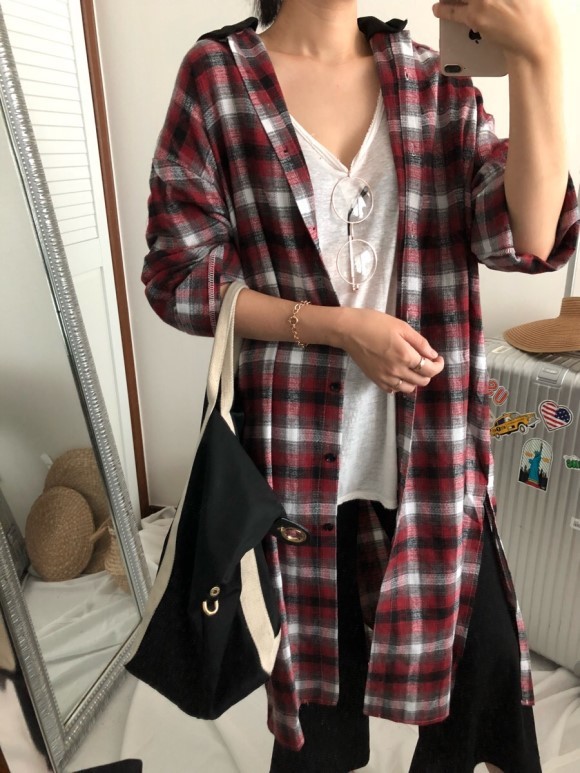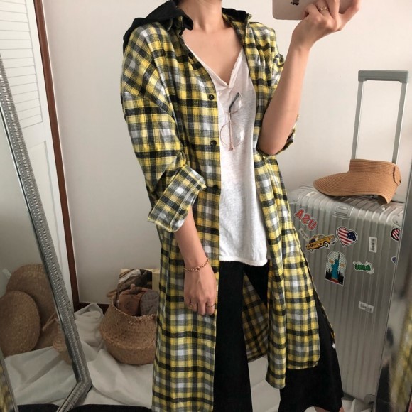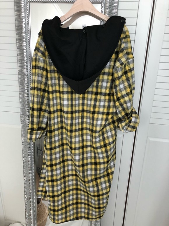 캐쥬얼한 체크의 후드가 달려있는 롱한 원피스에요