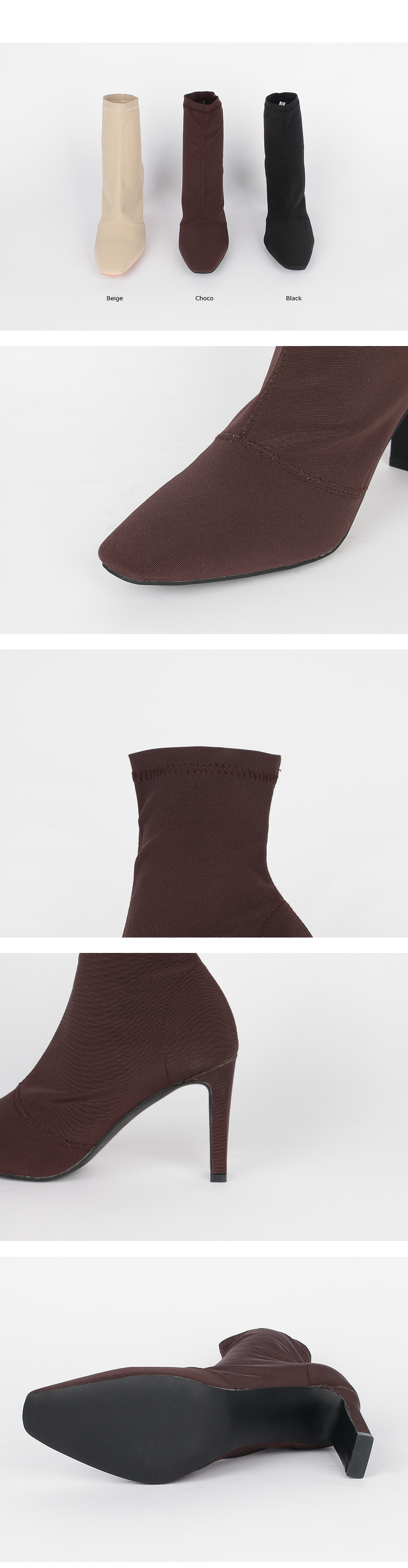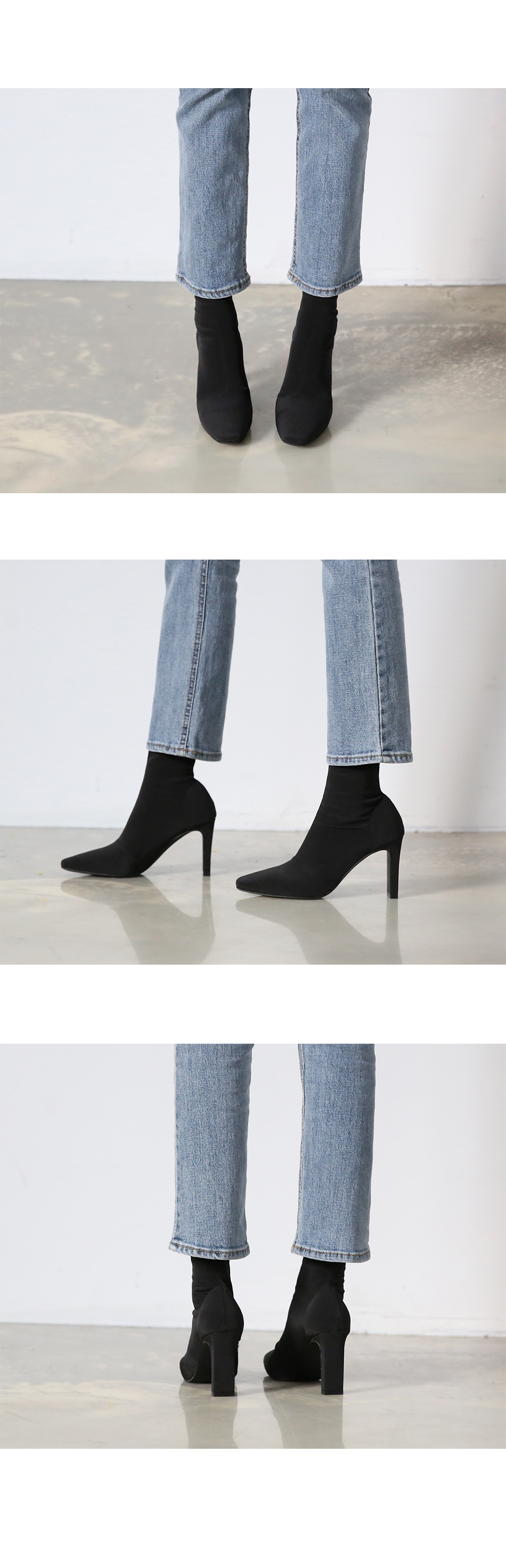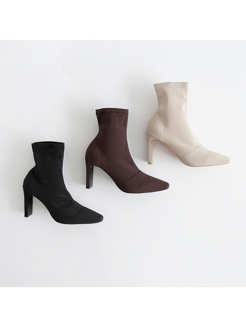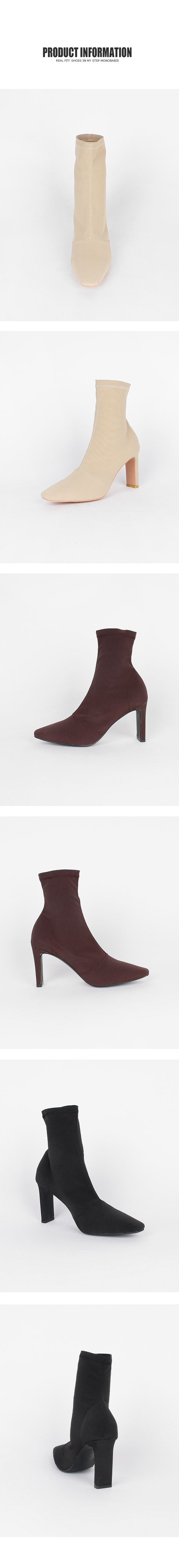 스판덱스소재로 쫀쫀한 텍스쳐가 느껴지는 앵클부츠로 슬라이스한 굽라인과 적당히 뾰족한 쉐입으로 이지하게 드레스업됩니다.