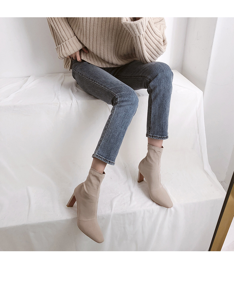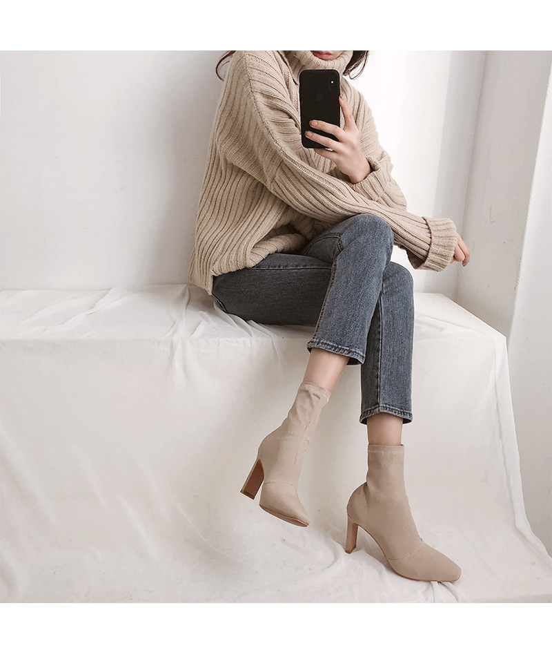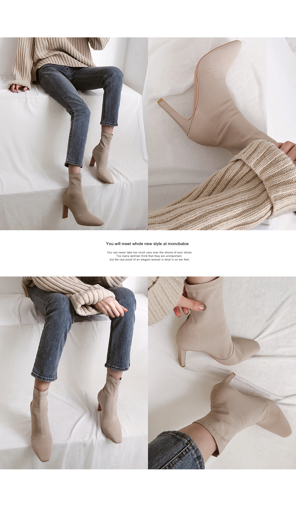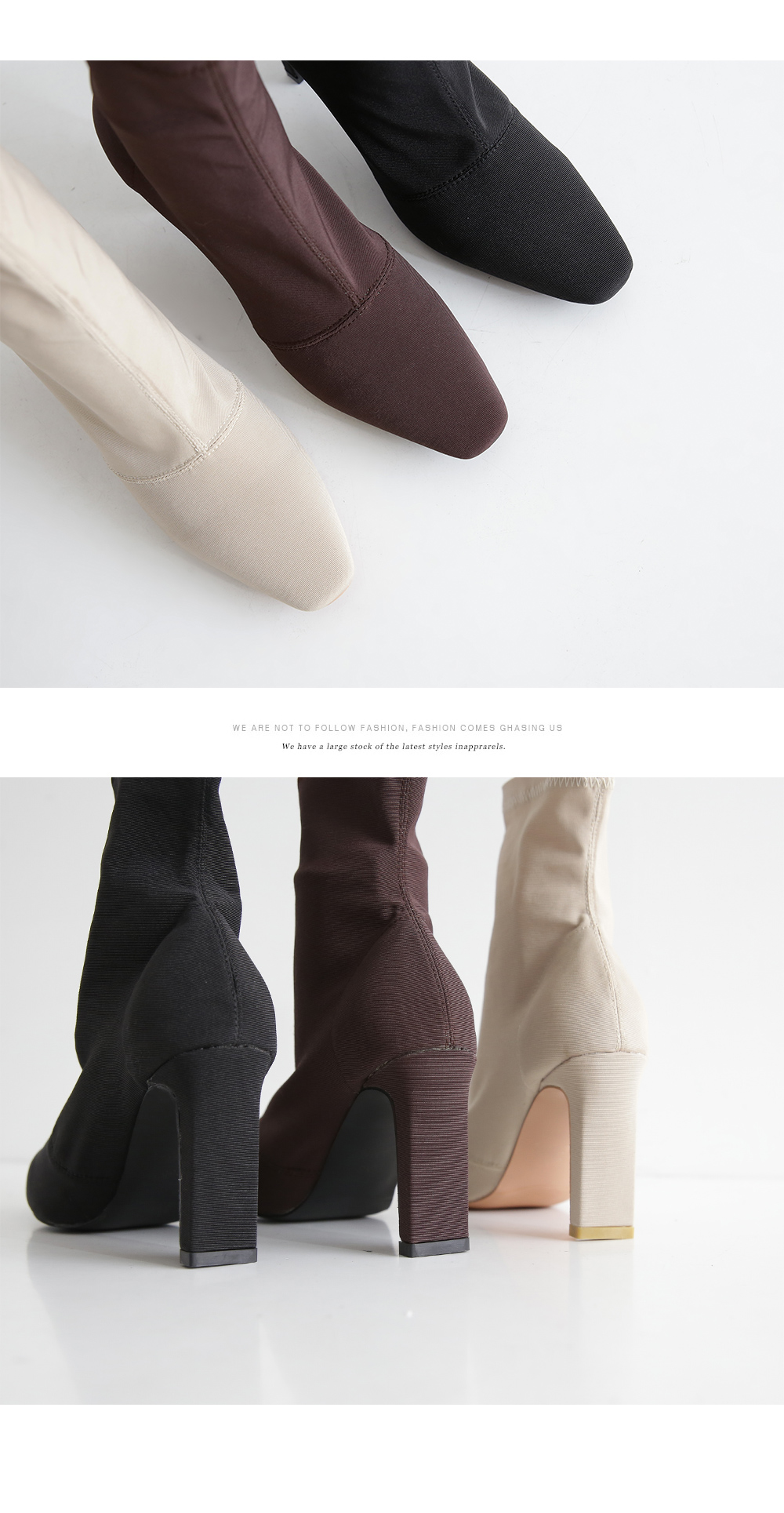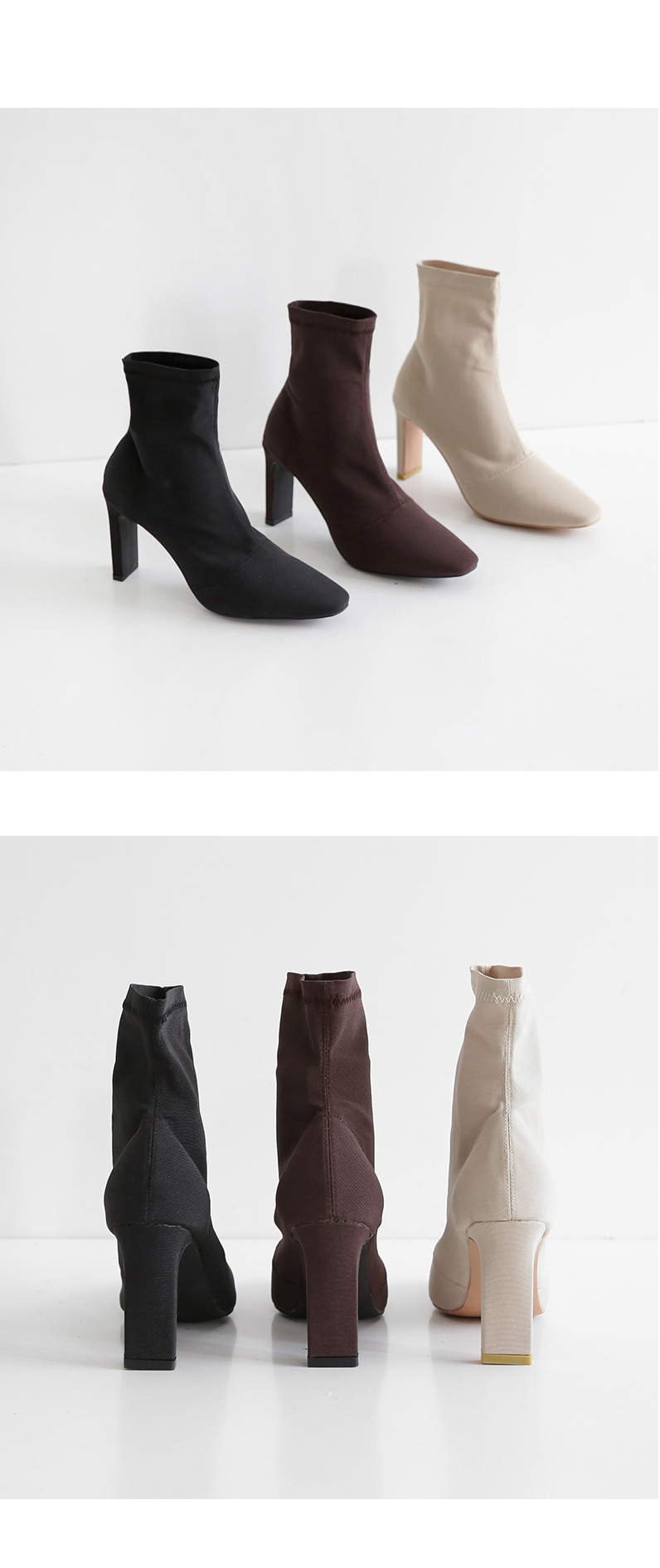 스판덱스소재로 쫀쫀한 텍스쳐가 느껴지는 앵클부츠로 슬라이스한 굽라인과 적당히 뾰족한 쉐입으로 이지하게 드레스업됩니다.
