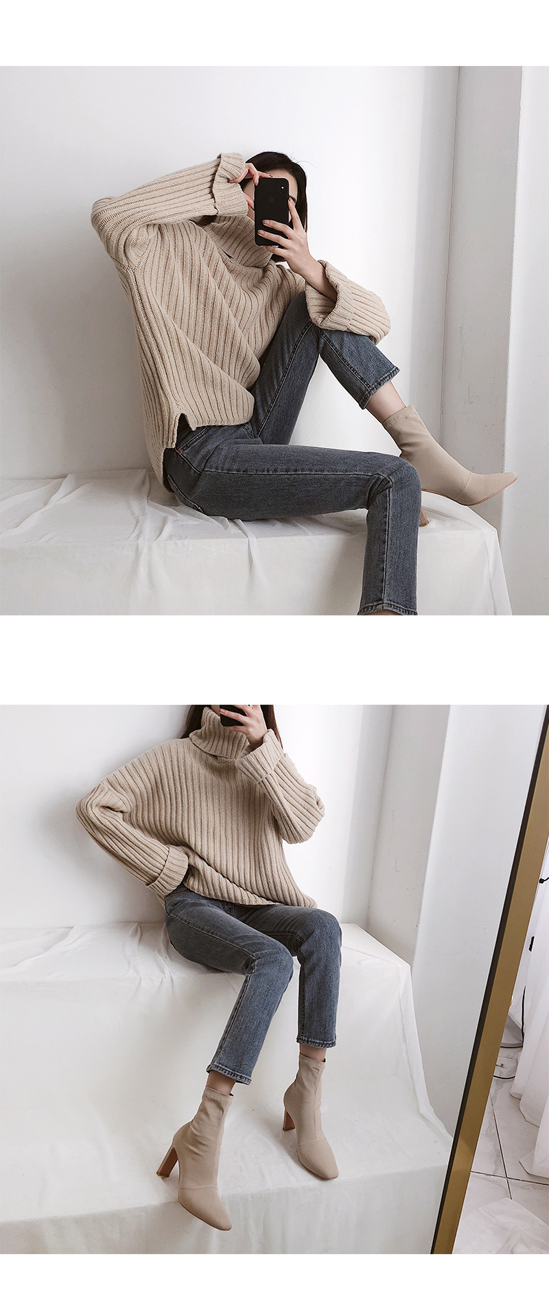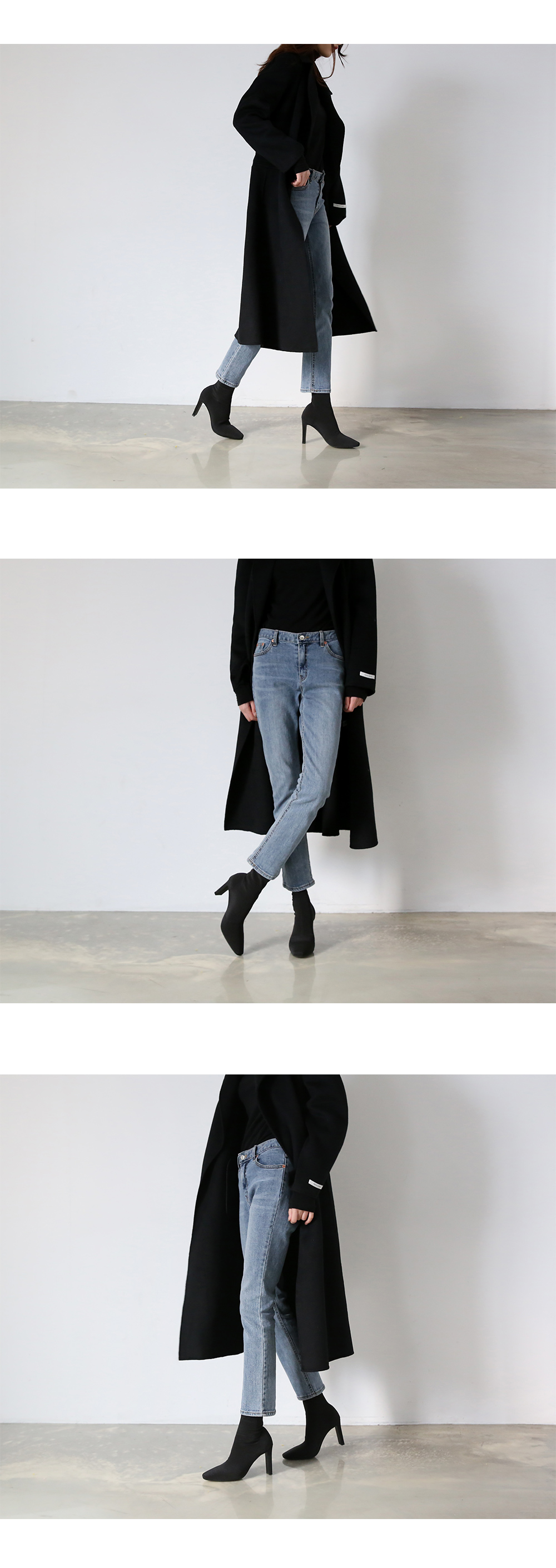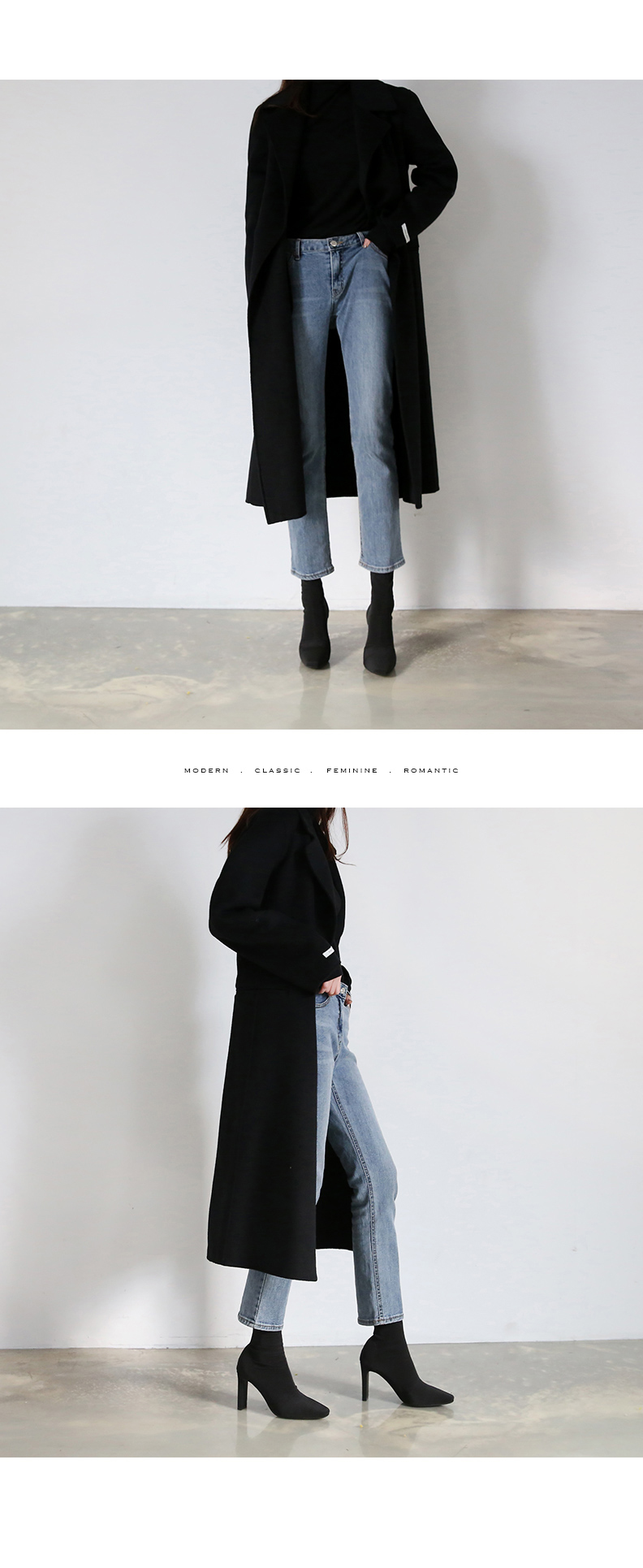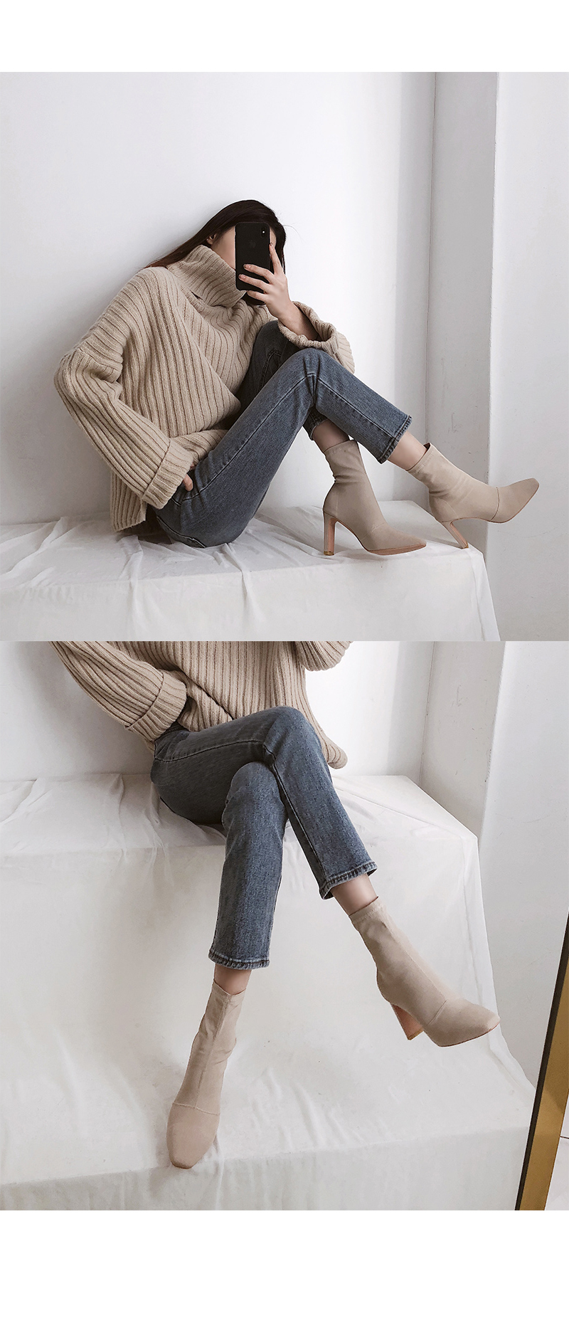 스판덱스소재로 쫀쫀한 텍스쳐가 느껴지는 앵클부츠로 슬라이스한 굽라인과 적당히 뾰족한 쉐입으로 이지하게 드레스업됩니다.