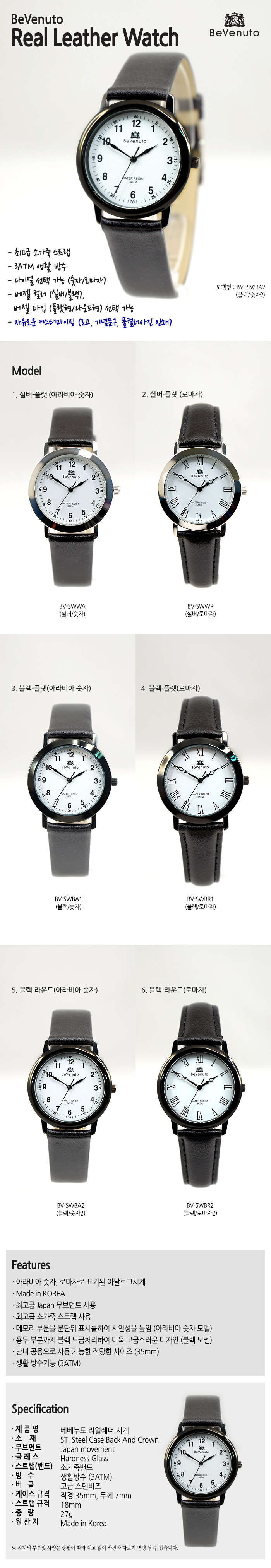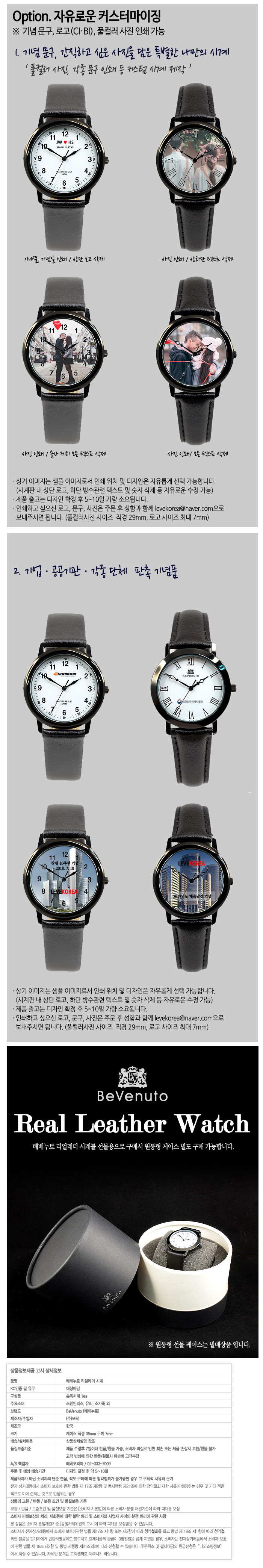 소가죽 스트랩으로 고급스러움을 담은 리얼레더 손목시계 - 제품규격 : 직경35mm, 두께7mm - 제품옵션 : 실버,블랙(플랫형),블랙(라운드형) / 아라비아숫자,로마자 - 제품구성 : 시계 - 제품재질 : 스테인레스, 유리, 소가죽 외 - 인쇄사이즈 : 풀컬러사진 인쇄 사이즈 직경29mm, 로고 인쇄 사이즈 최대 7mm - 제품발송 : 디자인 확정 후 5~10일 소요 ※ 주문제작 고객님은 주문 후 성함과 함께 인쇄를 원하는 텍스트/이미지/사진 등의 정보를 이메일(levekorea@naver.com)로 보내주시길 바랍니다. |