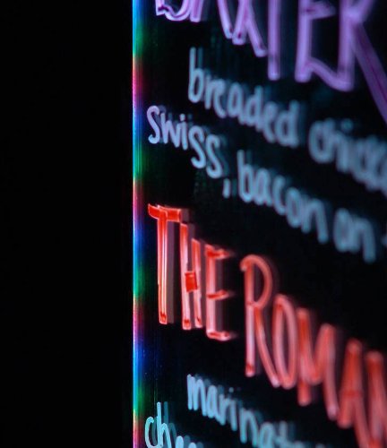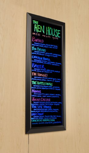 -. Feature : Large writing surface area (38 inches by 14 inches). / Push button control rotates through 13 different illumination effects. / Wall-mounting frame can be positioned either vertically or horizontally. / Suspension wire only accommodates the sign in portrait form. / Cleaning cloth is included with purchase; designed for use with liquid chalk and wet-erase markers.