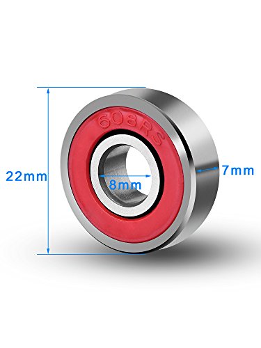 -. Feature : Skateboard bearings: 10 pieces skate bearings, 2 colors, red and black, 5 pack each color; Inner diameter is 8 mm and outer diameter is 22 mm, 7 mm in thickness / Durable and efficient: longboard bearings are made from bearing steel, durable, resistant to deformity under heavy loads, providing smooth and efficient bearing roll / Double shield: 608 2RS skateboard bearings have non-contact, removable shield for easy cleaning and less friction / Note: If you use it for the main spin bearing of finger toy, please make sure the size of bearing is 608 bearing and clean the oil of bearings; The oil can anti-rust and lengthen life, but will reduce the speed / If you want to keep your bearings a lengthen lifespan, please keep bearings clean, dry and maintain with slushing oil and lubricating oil regularly