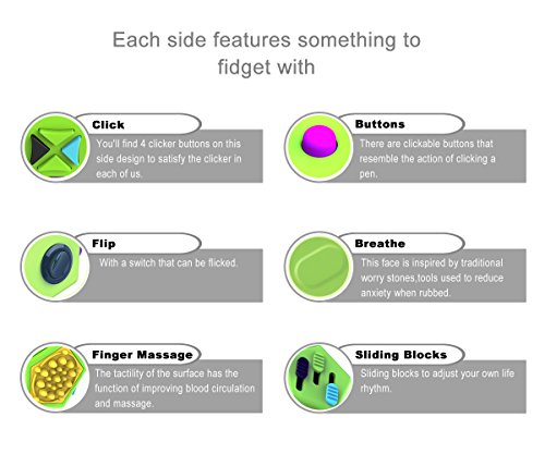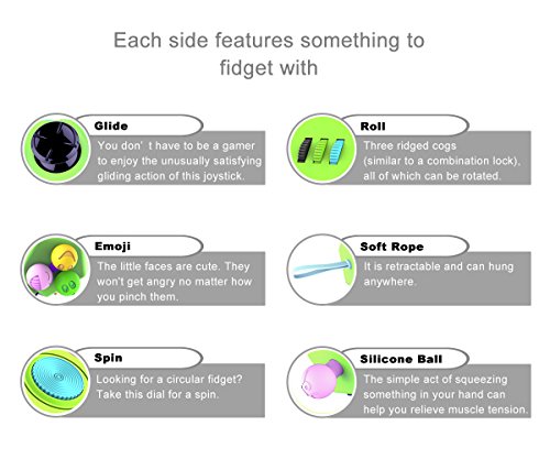 · Spin - Looking for a circular fidget? Take this dial for a spin · Buttons - There are clickable buttons that resemble the action of clicking a pen · Soft Rope - It is retractable and can hung anywhere · Click -You'll find 4 clicker buttons on this side design to satisfy the clicker in each of us · Glide - A joystick similar to those found on some gamepads · Sliding Blocks - Sliding blocks to adjust your own life rhythm · Roll - Three ridged cogs (similar to a combination lock), all of which can be rotated · Flip - with a switch that can be flicked · Finger Massage - The tactility of the surface has the function of improving blood circulation and massage · Breathe - This face is inspired by traditional worry stones,tools used to reduce anxiety when rubbed · Emoji - The little faces are cute. They won't get angry no matter how you pinch them · Silicone Ball - The simple act of squeezing something in your hand can help you relieve muscle tension or to exercise the muscles of the hand 0 |