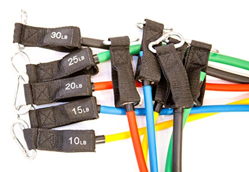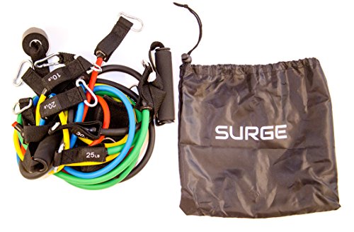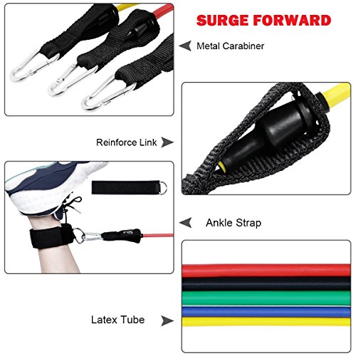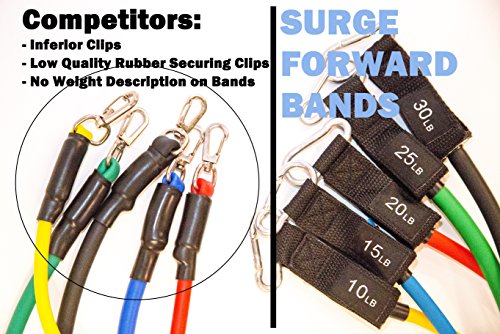 ★Surge Forward Stackable Resistance Band Set★ Why Surge Forward? Surge Forward stackable resistance band set is simply the best band set on the market. This exercise band set was designed to bring a gym quality product to you home at an affordable price. With help from professional fitness instructors, our design team built the most durable resistance band set on the market. With exercises designed to target biceps, triceps, chest, upper/lower back, abs/core, and legs, the workout potential is endless. Improving your health and overall wellness from the comfort of your home can now be a reality. Surge Forwards bands last longer as each band is manufactured using our proprietary extruded blend of synthetic and natural rubber. Our process has increased the consistency of resistance while prolonging the life of the band. We have tested our proprietary rubber against other exercise bands on the market and have found ours to be much more durable, while keeping desired tension throughout the testing process. We are so confident in our band design we offer a lifetime warranty on all our equipment! ? Features commercial grade grommets ? High thread count nylon and double stitching at all seams ? Proprietary extruded blend of synthetic and natural rubber ? Consistency of rubber process prolongs the life of each band ? Each band has durable carabiner clips rated up to 200lbs each ? Includes manufactures Lifetime Warranty 0