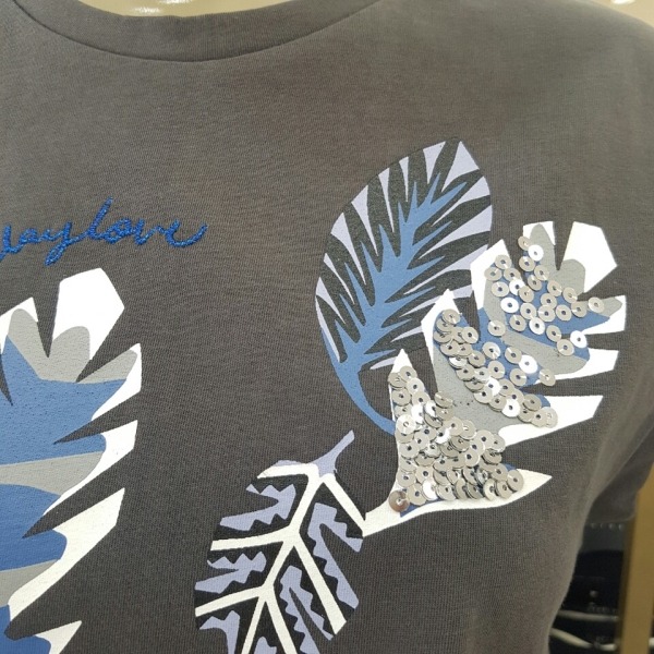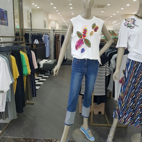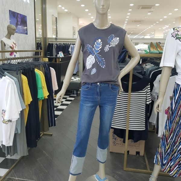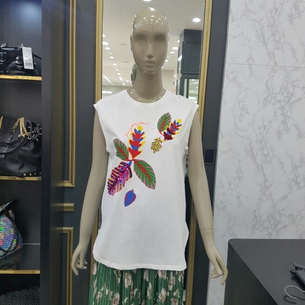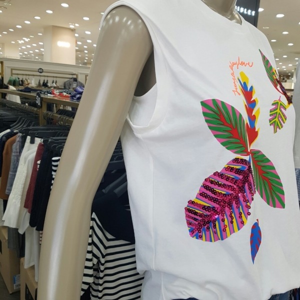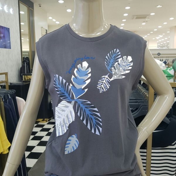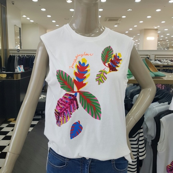 커다란 잎사귀위에 스팽글과 레터링 자수로 포인트를 준 나시 티셔츠입니다약간의 캡소매로 부담감없이 입을수있습니다총기장 63cm정도로 스키니한 하의에 꺼내입으셔도 힙 충분히 덮는 기장입니다?