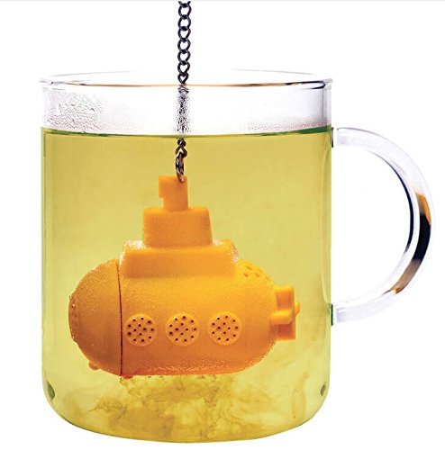 Are you the type of person who will always be young at heart and ready to laugh and play whenever possible? Do you love a great cup of tea, brewed from herbs or loose tea leaves? Whoever said "Don't play with your food" has never seen our Yellow Submarine tea infuser set! Two mini submarines with hatches that open to fill with loose tea or herbs sink slowing into the depths of your teacup or teapot to brew you a fantastic cup of tea! There is a yellow submarine (of course) and a blue one, too, so you can play that the Blue Meanies are chasing your yellow submarine while you wait for your tea to brew! The subs are made of food-grade silicone material that is non-toxic, heat-resistant and dishwasher safe. There's a stainless steel chain with a hook to hang on the cup for easy removal when the brewing mission is complete! This is a great gift idea for a fun-loving family member or friend, and you could even add a package of loose tea, and a clear glass mug for submarine viewing, to make a gift basket that will bring lots of laughter and appreciation! Now, are you ready? Sing it with us... ".In the town where I was born, lived a man who loved loose tea, And he was happy every day, with our Yellow Submarine.