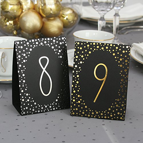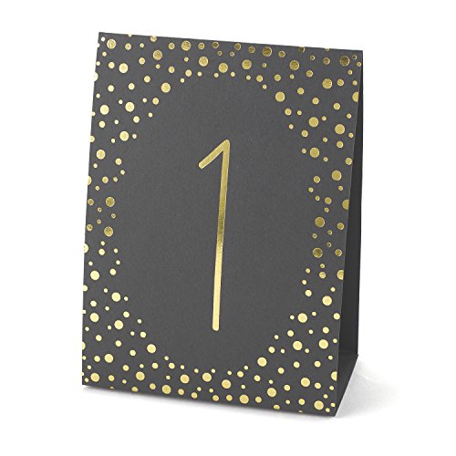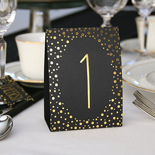 Set of 40 table number tents;Black paper printed on both sides with gold foil;5-Inches tall when folded; minor assembly required;Also available in black and silver;Hortense b. Hewitt has a wide range of options for your table numbering needs
