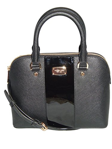-. Brand : Michael Kors -. Color : Black -. Department : womens -. EAN : 0191262025310 -. Feature : Saffiano Leather; gold tone hardware, zip closure / Double handles, removable & adjustable strap - drop 17" - 20" / Signature lined interior; 4 open multi-function pockets, 1 zip pocket / Protective feet on bottom / Approximately: 9.75" W (at base) 8.75" W (at top) x 8" H x 4" D -. ProductGroup : Shoes -. ProductTypeName : HANDBAG -. Size : Small -. Title : Michael Kors - Met Center Stripe Cindy Small Dome Leather Satchel - Black -. UPC : 191262025310