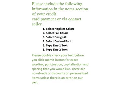 -. Binding : Health and Beauty -. Brand : Presents Forever -. EAN : 0616348737593 -. Feature : Please take a look at the pics for all available colors, foils fonts and designs. / Please dont' forget to email us all your personalization info. / We will P.R.Int and ship your item within 48 hours as long as we have all the personalization info. / Visit our Amazon store for other personalized items. / Please contact us if you have any additional questions P.R.Ior to your purchase. -. Label : Presents Forever -. Manufacturer : Presents Forever -. PackageQuantity : 50 -. ProductGroup : Health and Beauty -. ProductTypeName : HEALTH_PERSONAL_CARE -. Publisher : Presents Forever -. Studio : Presents Forever -. Title : 50 personalized luncheon napkins wedding favors custom P.R.Inted napkins baby shower -. UPC : 616348737593