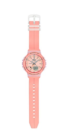 This ladies Casio Baby-g Step Counter watch has a plastic/resin case and is powered by a chronograph quartz movement. It is fitted with a orange rubber strap and has a orange dial. The watch has a date function. Includes alarm function.