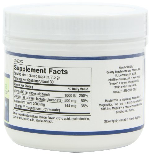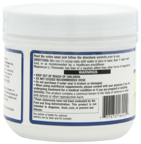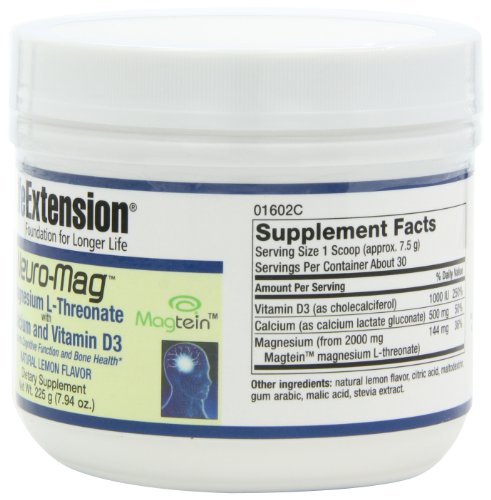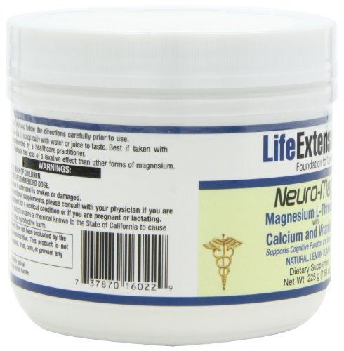 -. Binding : Health and Beauty -. Brand : Life Extension -. EAN : 0737870160229 -. Feature : Highly absorbable brain health-supporting magnesium is available in a good tasting powder mix / Magnesium is needed for more than 300 biochemical reactions in the bo / L-threonate contained in Neuro-Mag shows to boost magnesium levels in spinal fluid -. IsAdultProduct : 0 -. Label : Life Extension -. LegalDisclaimer : These statements have not been evaluated by the FDA. These products are not intended to diagnose, treat, cure, or prevent any disease. -. Manufacturer : Life Extension -. MPN : 01602 -. NumberOfItems : 1 -. PackageQuantity : 1 -. PartNumber : 01602 -. ProductGroup : Health and Beauty -. ProductTypeName : HEALTH_PERSONAL_CARE -. PublicationDate : 2012-06-26 -. Publisher : Life Extension -. ReleaseDate : 2012-08-20 -. Size : 225 g -. Studio : Life Extension -. Title : Life Extension Neuro-Mag Magnesium L-Threonate w/ Calcium and Vitamin D Lemon 225 gram powder -. UPC : 737870160229