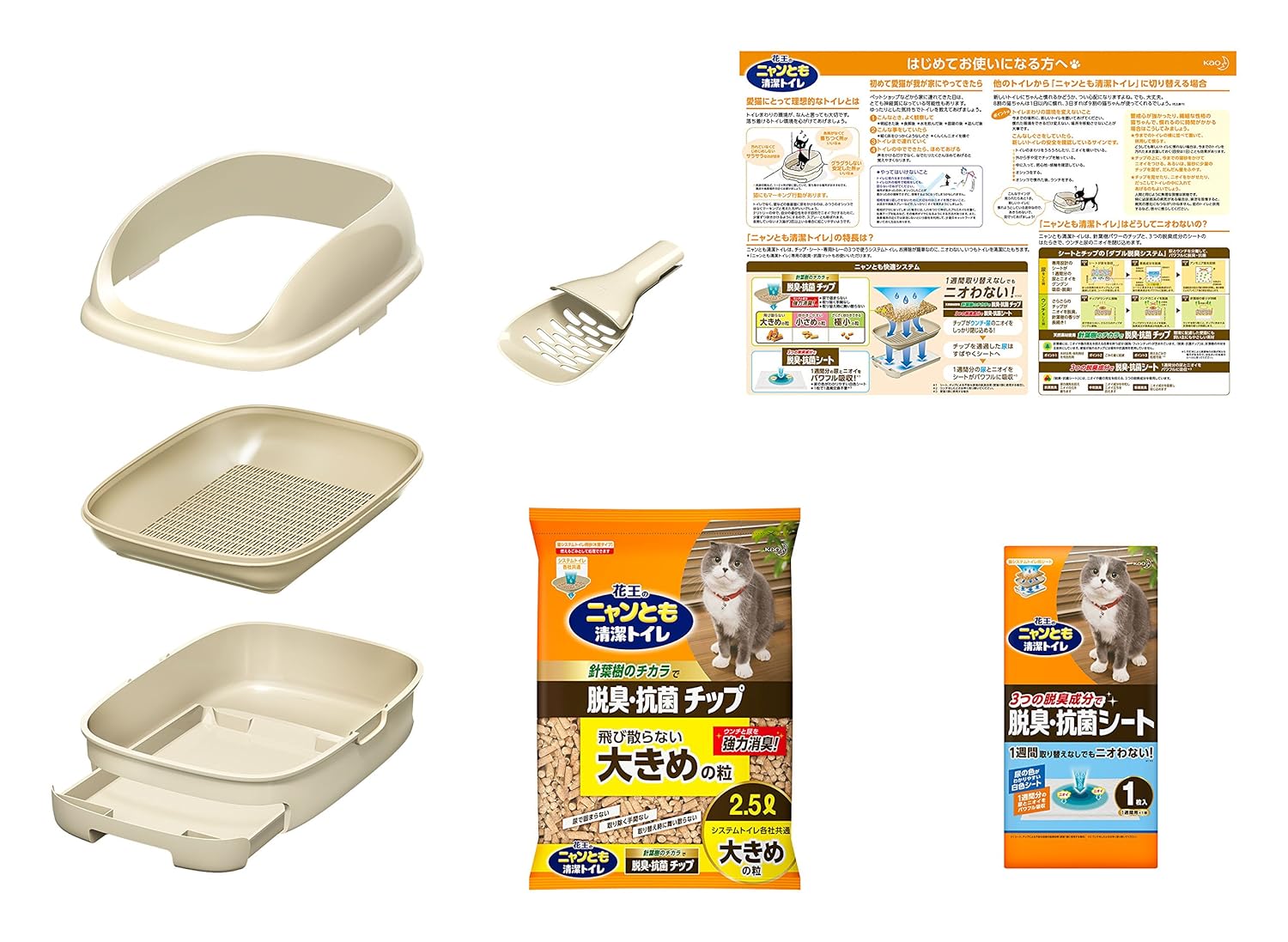 ●シート:抗菌・中和・吸着の3つの脱臭成分を配合。尿とニオイを吸収・脱臭。尿の色がわかりやすい白色シートです
