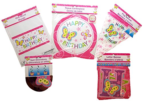 Studio : Greenbrier International Publisher : Greenbrier International Binding : Health and Beauty Product Description This 5 piece bundle includes a 10 in centerpiece, one pack of hanging swirl decorations with butterflies (set of 3), a Happy Birthday letter banner 7ft, a pennant shaped flag banner 12ft and one Happy Birthday wall mural 42 in X 72 in. 0