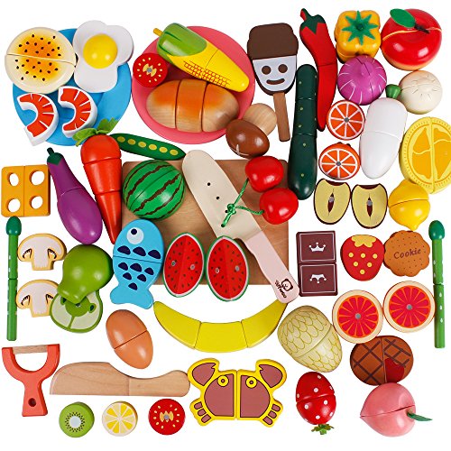 -. Feature : Deluxe 51 Pieces Wooden Play Assortment Kitchen Set - including many kinds of food, fruits, vegetables and kitchen tools. / Made of wood with non-toxic water based paint. All wooden pieces with smooth edges and round corner, safe and durable toy for kids. / Intersting toys to kids. It helps developing fine motor skills and hand-eye coordination, encouraging independent play and even introducing the concept of part and whole. / The pieces are combined with magnetic, can be pretend sliced and peeled. More durable than other food toys combined with Velcro. Excellent for enhancing dexterity and encouraging imagination. / For age 2 years old and up. Easy to collect and carry with the storage container.