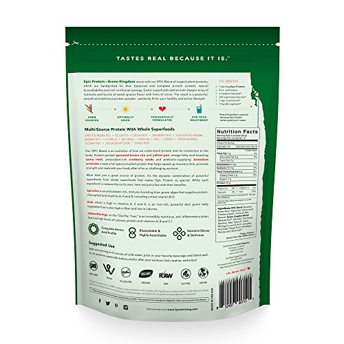 Sprout Living Epic Protein Powder Green Kingdom 1 lb starts with our organic plant proteins, which are handpicked for their balanced and complete protein content, natural bioavailability and rich nutritional synergies and provide 20 grams of complete protein per serving. Our potent blend of land and sea plant life includes Spirulina, an antioxidant-rich blue-green algae with supplies of protein and vitamins A, K and B; Kale, which is high in vitamins A, C and K and has a superb calorie to protein ratio; and Indian Moringa, or the “Clarifier Tree,” an incredibly nutritious plant that has significant quantities of calcium, protein and vitamins A, B and C, resulting in an incredibly dynamic, superfood-enriched protein powder that will help boost and strengthen your bodyFeature