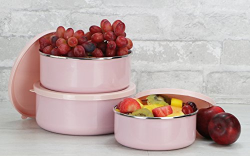 Reston Lloyd is a leading manufacturer and distributor of kitchenware, specializing in enamel on steel products. For nearly 30-year, we have been dedicated to providing the highest quality products, with an equal emphasis on superior customer service. Calypso Basic's six piece storage bowl set comes with three bowls and three air tight plastic sealable lids in the same fun color. Each bowl is made of enamel on steel with stainless steel rims. The set includes three bowls; -3/4 quart, 1-1/4 quart, 1-3/4 quart with lemon yellow color enamel on the outside and white enamel interior. This bowl set is great for storage, mixing (please use wooden/silicone utensils) and even looks great as a serving bowl.Feature