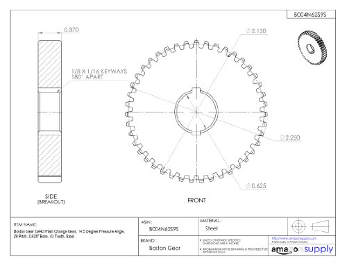 Boston Gear GA43 Plain Change Gear, 14.5 Degree Pressure Angle, 20 Pitch, 0.625" Bore, 43 Teeth, Steel