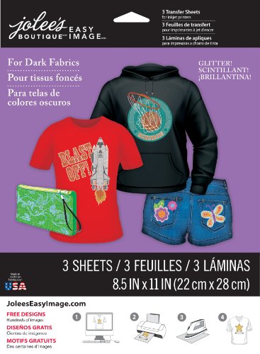 Create your own glittering designs for t-shirts, sweatshirts, tote bags and more with Jolee's Boutique Easy Image Iron-on Glitter Transfer Paper for Dark fabrics. It's Simple: choose from tons of images in JoleesEasyImage.com gallery or create your own. Print out and then use a household iron to transfer your design to fabric. Fabric is hand or machine washable after transfer. Includes 3 sheets, each 8.5-Inch-by-11-Inch.Feature