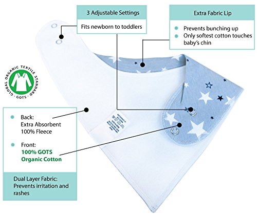 ❤ ABSORBENT ORGANIC COTTON DROOL BIB - With double layer design - extra soft GOTS certified organic cotton in front layered with soft polyester fleece behind, our teething bibdana is super absorbent! Our drool bib will shield your baby away from all the dribble and spit ups to avoid drool rash and eczema. Stop changing your babies or toddler more than you need to and save time on endless laundry. Besides teething necklace, teether sophie giraffe, this is a must have for a drooling baby.