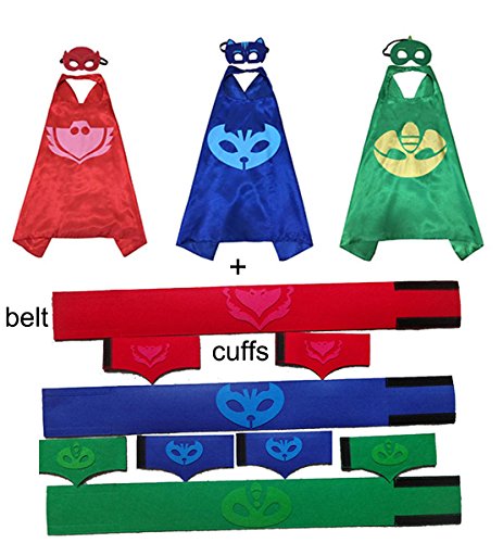 -. Brand : Heyfun -. Color : Multicoloured -. Department : boys -. Feature : Package includes 3 packs cosplay capes and masks + 3 Belt and cuff sets,what you see is what you get / safe material for kids to play / great gift for kids whoever are Disney Junior PJ masks' fans / cape size:27" * 26" ,Belt is 33 inches long and 8" for the cuffs -. IsAdultProduct : 0 -. ProductGroup : Apparel -. ProductTypeName : ADULT_COSTUME -. Size : M -. Title : 3 packs Halloween Cosplay Costume Cape & Mask + 3 Sets Belt and Cuff Powerband -. UPC : 735980009032