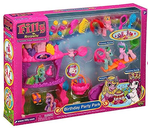 -. Feature : Includes 3 Filly Royale figurines, tiered play set, teeter-totter, 2 combs, 2 Mirrors, 6 hair clips, present and birthday hat. / Each Filly's crown has a different inset crystal from Swarovski, the world famous Austrian crystal maker. Fillies have colorful tails that can be styled. / Filly Royale ponies are great party favors, rewards, gifts, and Collectibles! / There are over 21 regal Filly Royale ponies to collect and trade! each filly royal has a beautiful flowing tail, her own unique leg marking, and glittering crystal crown! / Recommended for ages 3 and up.