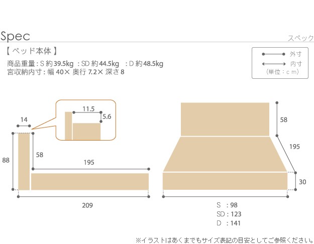 サイズ(cm):幅123x奥行209x高さ88(床板高さ30)cm・約45kg