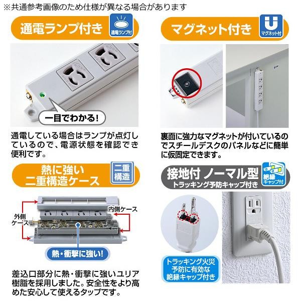 | 6個口(3P抜け止め)、VCTFコード仕様、3Pプラグ(絶縁キャップ付き)のタップです。電源状態が確認できる通電ランプ付き。裏面にマグネットが付いているので、スチールのデスクなどに仮固定することができます。メンテナンスがしやすく便利です。 |