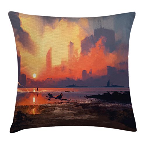 (Ambesonne)/Bedding Bath/Bedding/DIRECT FROM USA/Fantasy World Throw Pillow Cushion Cover by Ambesonne, Man on Sandy Beach with City Skyscrapers...