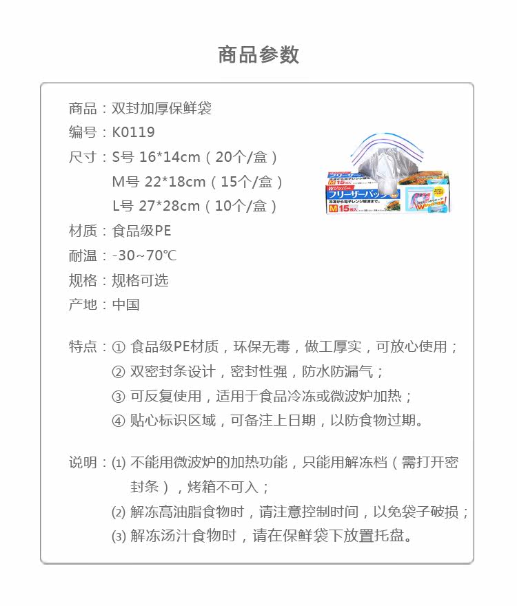 【双层密封,非常厚实,可反复使用,适用于食品冷冻、冷藏、微波炉加热。】