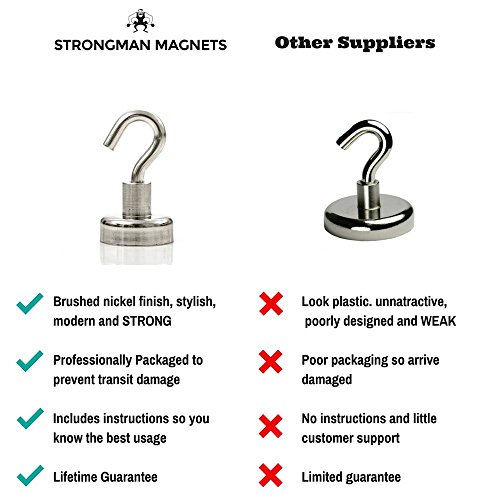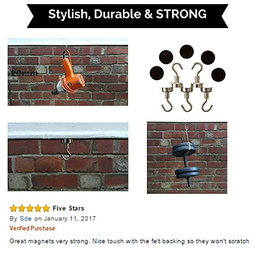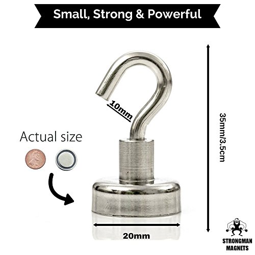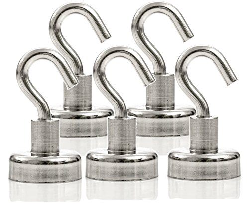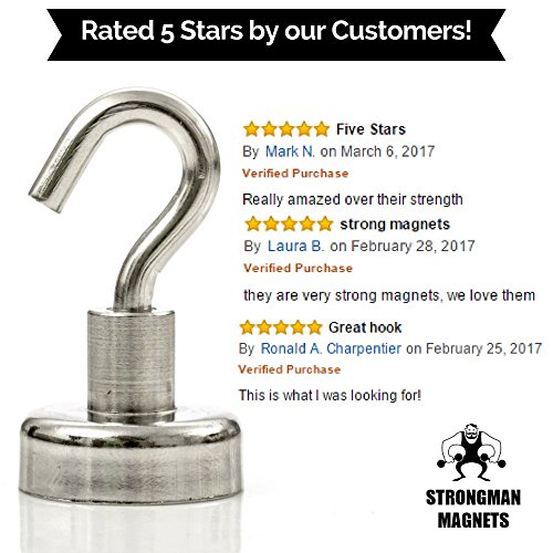 Strongman Magnets Powerful 25LB Neodymium Heavy Duty Magnetic Hooks! 5 Pack +3M Non Scratch Stickers! Multi Use Indoor/Outdoor Hook Magnets! Declutter and Add Storage Now!