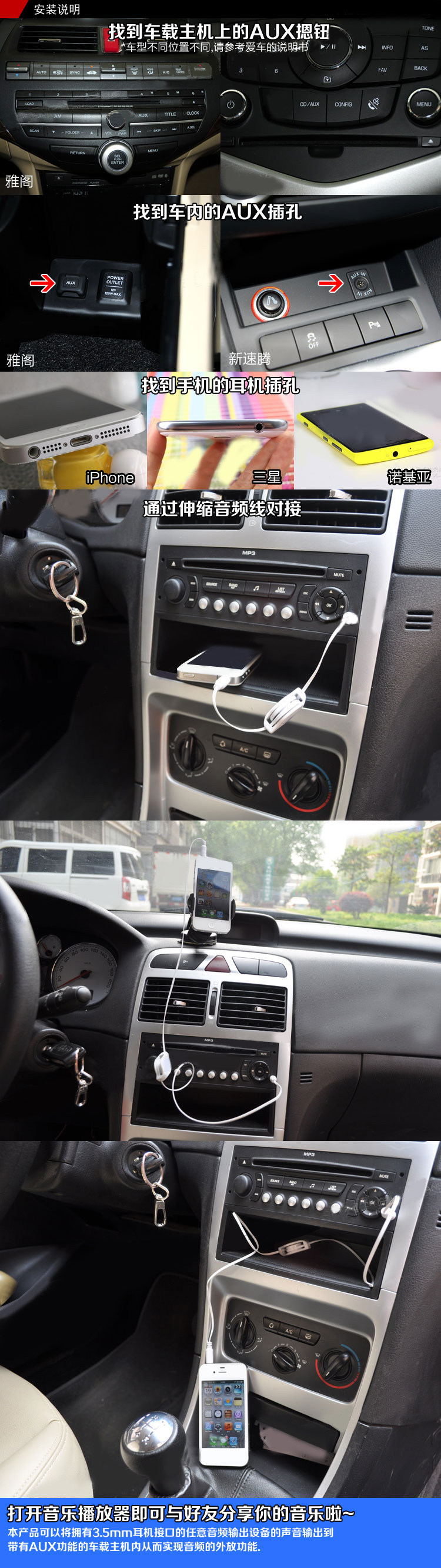 1.本产品为出口产品,适用于大部分数码设备带有3.5mm音频插孔的手机,IPHONE,MP3,PSP,GPS等带有AUX插口的音频连接,可以与车载音响播放器相连接。作为播放音乐之用。