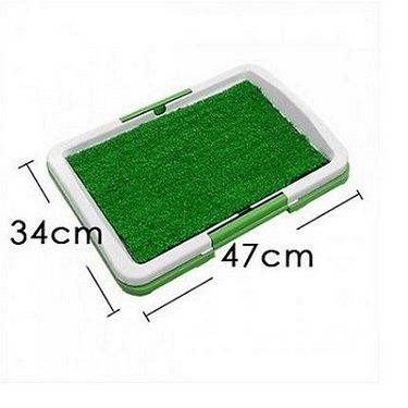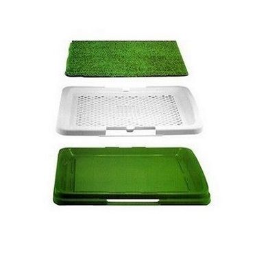 This mat and tray system gives dogs a place to relieve themselves when they can't go outside. The ingenious mat is made of an antimicrobial and odor resistant artificial turf that gives off an organic scent, attracting dogs so they can be taught quickly that it is an acceptable spot for relief. The mat sits on top of a plastic insert which allows liquid to drain into the included locking tray for easy clean up.