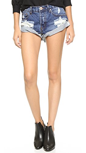 Edgy One Teaspoon cutoffs in shredded denim. Rolled cuffs. 5-pocket styling. 4-button fly.